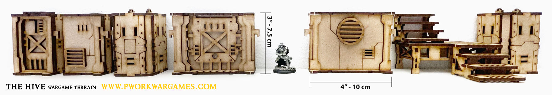 Explore dangerous industrial complexes, abandoned space bases or city sub-levels. Between close firefights, warriors can use walls and shelters, armored doors and platforms to protect themselves and surround the enemy, to destroy them in a ferocious melee. With The Hive modular line from Pwork Wargames you can build infinite battle scenarios or create unique terrain elements by combining multiple kits. Try using The Hive terrains with The Underhive gamemat, and you'll immediately are in a sub-level of a megacity or in the heart of a lost spaceship! The Hive is a line of wargame modular terrains that you can assemble in tons of different ways for your favorite tabletop game.